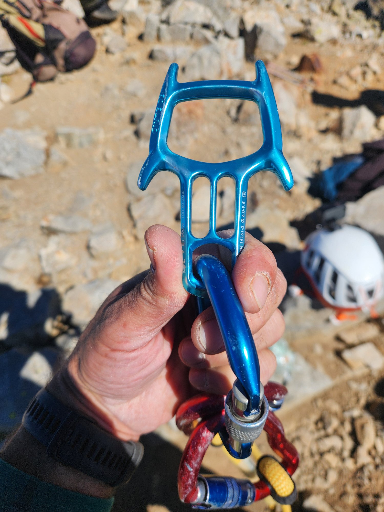 Au niveau design, c’est minimaliste mais en observant attentivement, on dénombre 4 ergots de freinage mais surtout un œillet de second de cordée. Ce serait le descendeur qui plie le game en terme de polyvalence. L’œillet de mousqueton est super pratique et ce quel que soit le mousqueton utilisé.