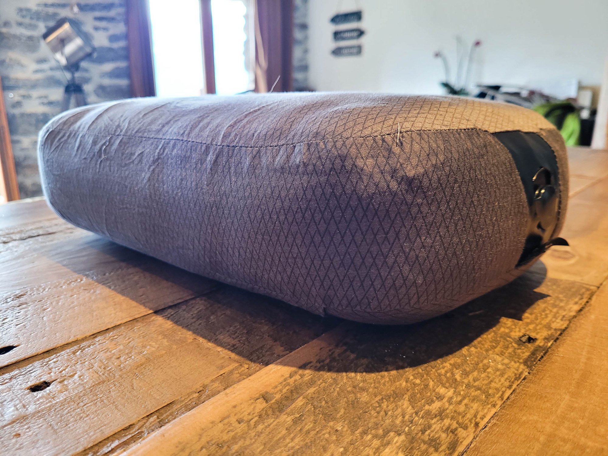 A l'usage, la mousse est confortable, le tissus est doux mais l'ensemble glisse sur le matelas gonflable. Pour pallier à ce problème, il m'arrive de glisser le coussin dans la capuche du sac de couchage.