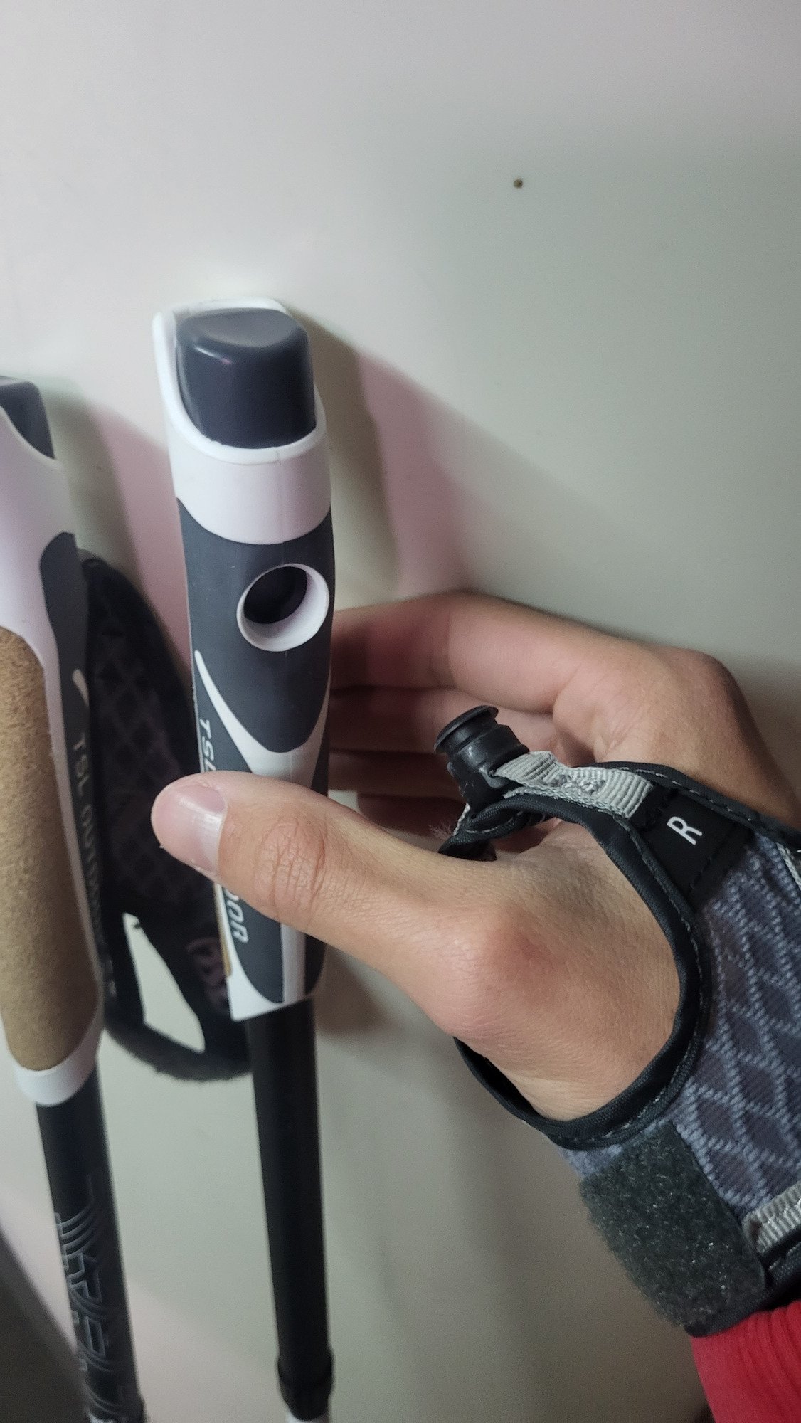 On peut clipser et déclipser la dragonne d’une seule main, même en mouvement, ce qui est extrêmement pratique en trek comme en trail :