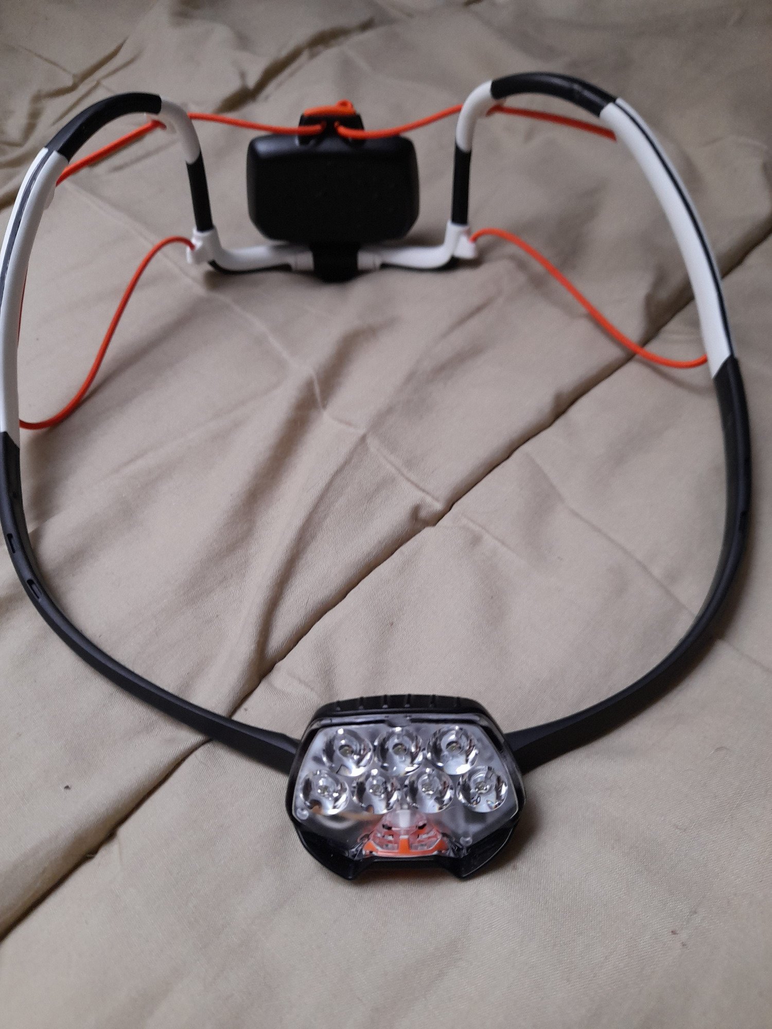 Pour la lampe sur la tête, un cordon de serrage orange situé en arrière permet d'ajuster la lampe au tour de tête. En courant, la stabilité est bien meilleure que pour une lampe avec sangle élastique traditionnelle et le poids sur l'avant est négligeable (on ne la sent pas).