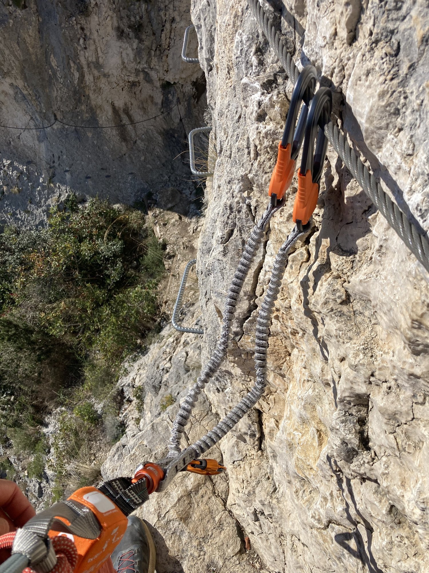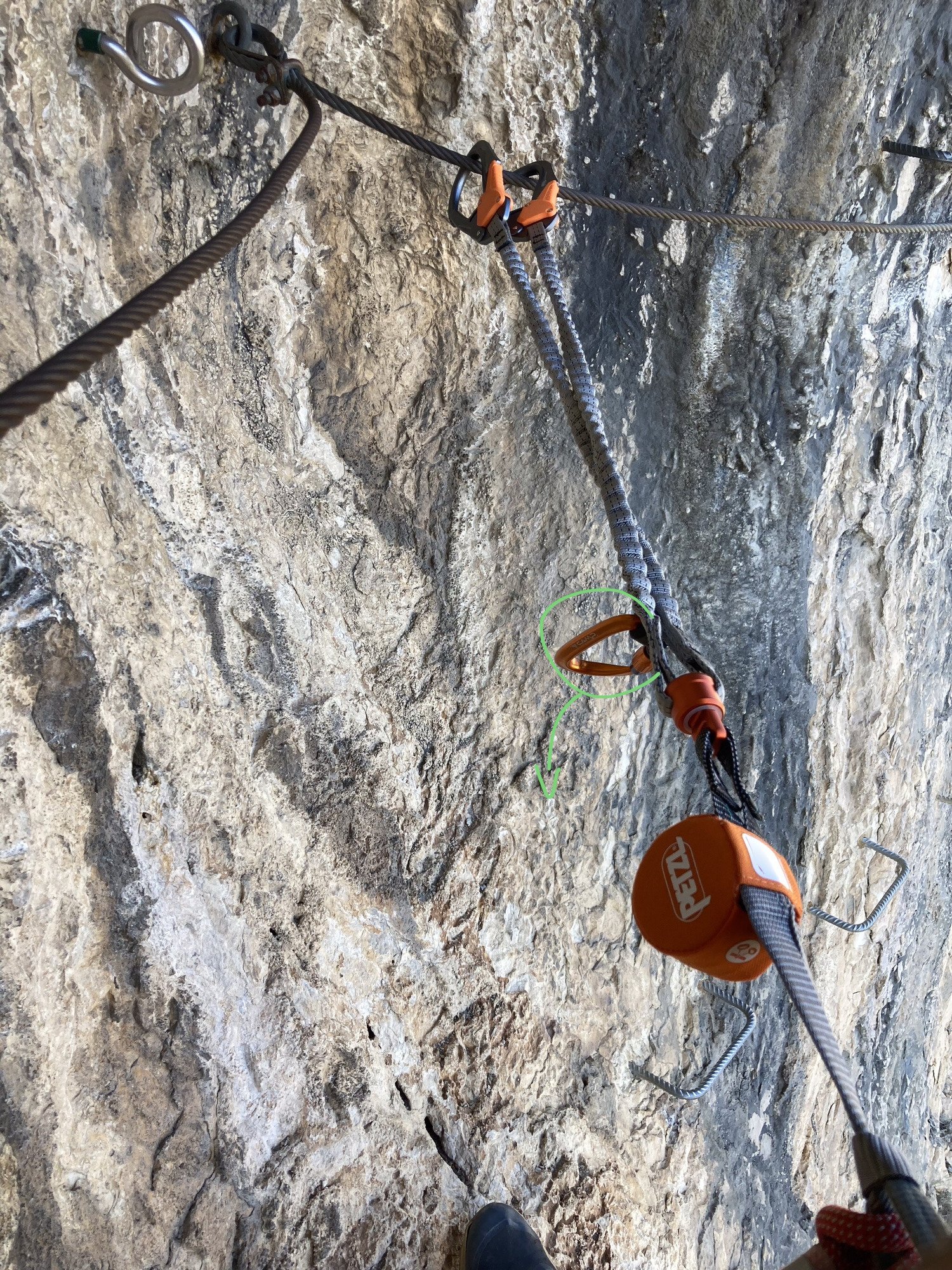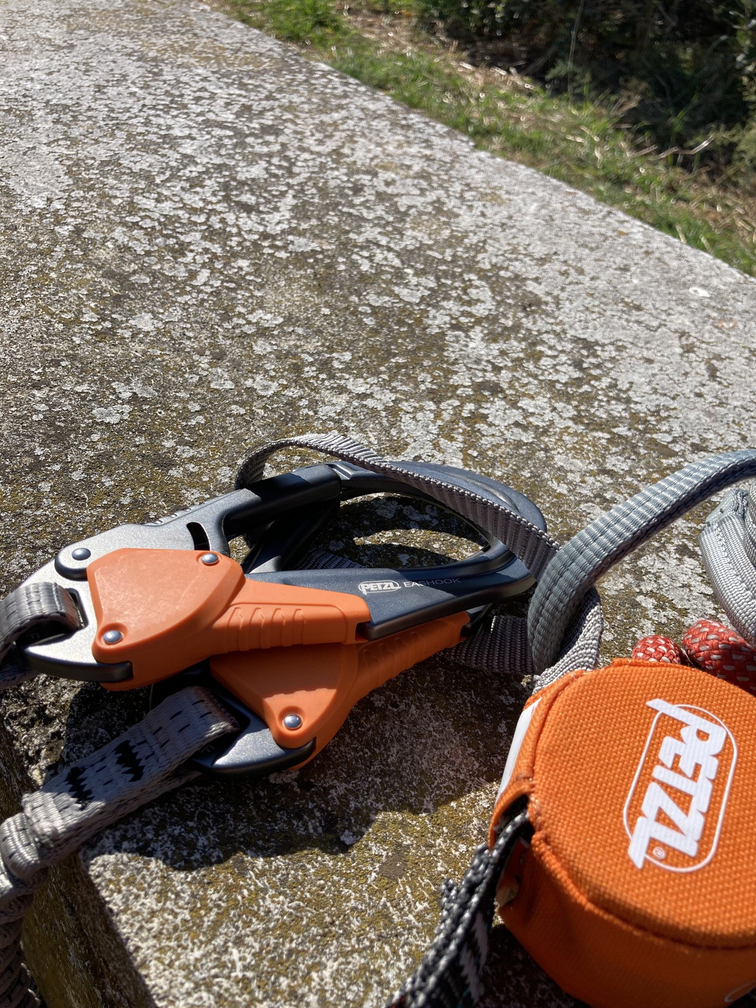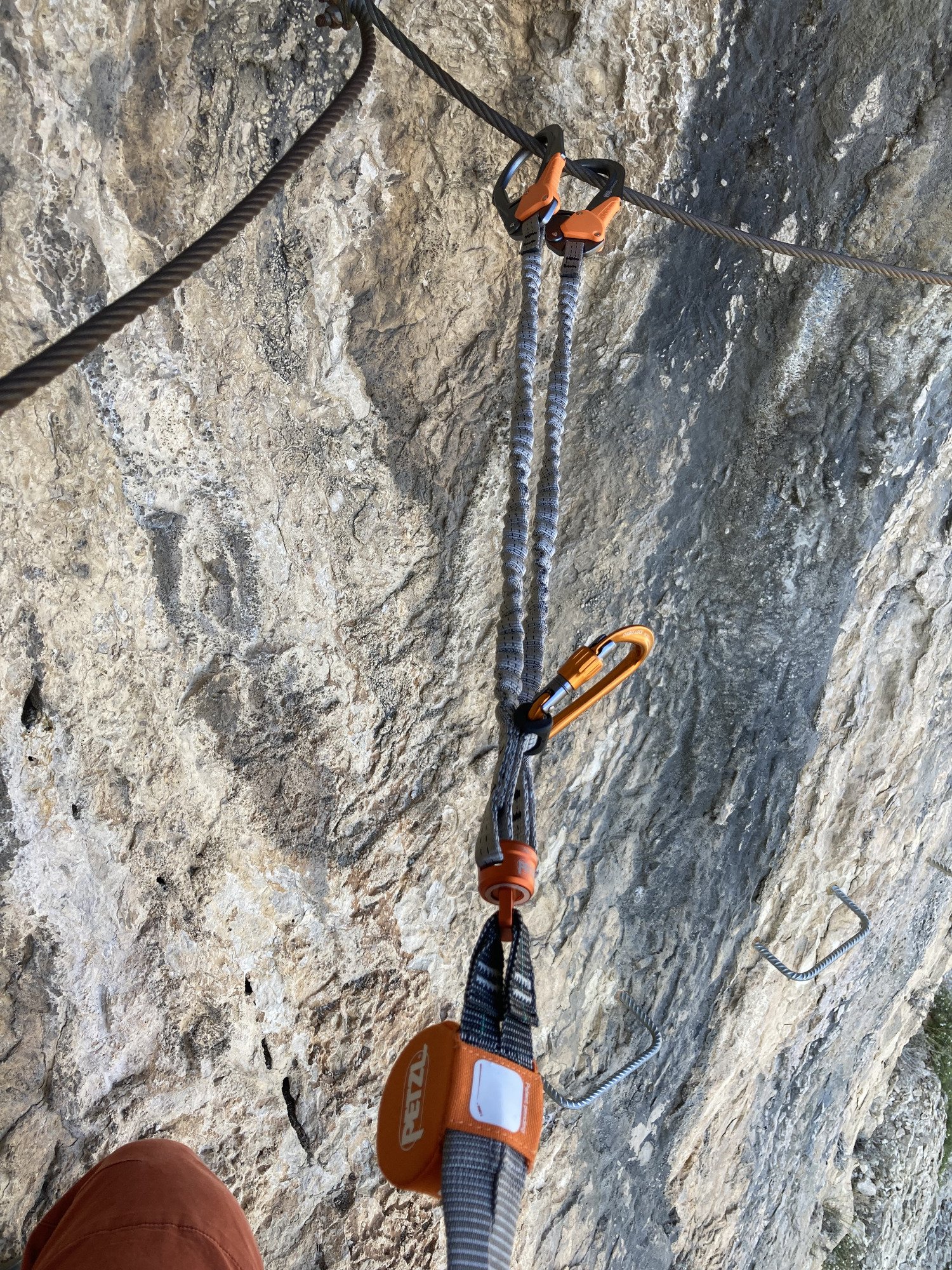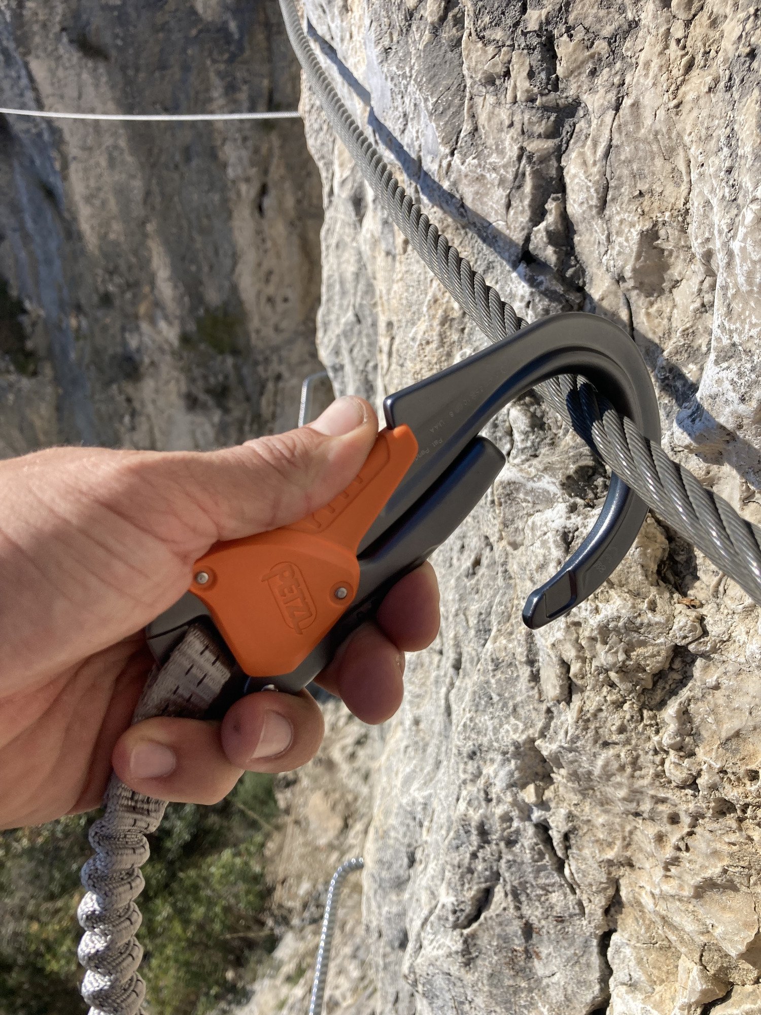Cette observation complète m’a permit de sortir les cinq premières photos, on y voit un bon sac de rangement qui peut servir aussi pour ranger du matériel pendant la sortie en le passant dans le baudrier (supposition d’une utilisation parallèle), un travail très propre que l’on connaît de Petzl dans la finition du produit. On voit sur la photo 4 que l’ouverture du mousqueton Eashook est très grande, ce qui se confirme en pratique avec la photo 9 où l’on voit bien que le cable de via peut passer sans encombre. Le système de déverrouillages pour l’ouverture est très facile à prendre en main et ne demande pas d’effort, on envisage donc de longues sorties pour lesquelles le mousqueton âge ne sera pas une limite physique. Et enfin la cinquième photo qui présente la particularité de ces longes : l’émerillon SW qui permet de faire tourner les longes entre elles pour éviter qu’elle ne se torsades l’une sur l’autre au fur et à mesure des mouvements autour des points d’encrages. Il tourne plutôt bien à vide ce qui me semble un bon point.