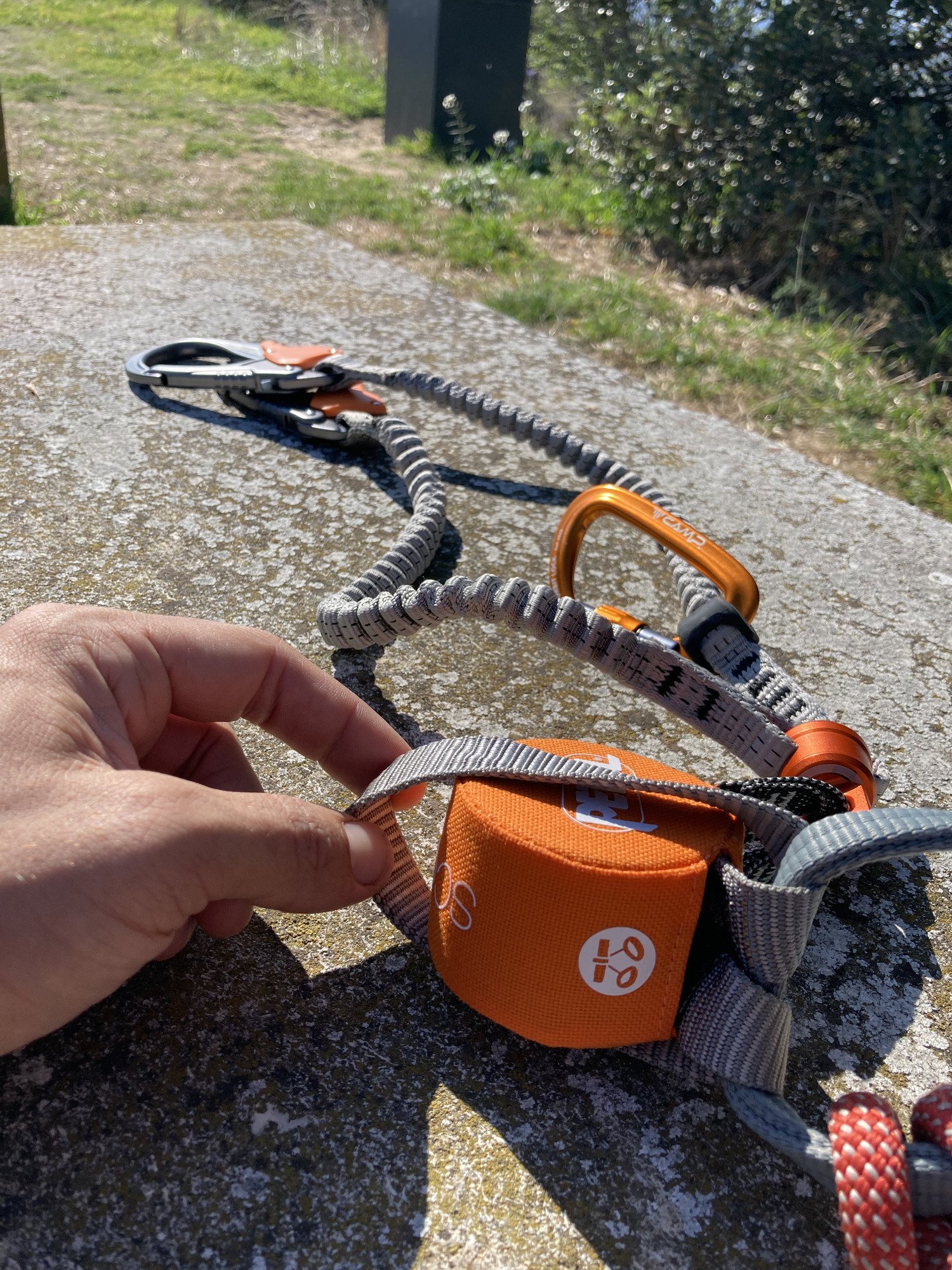 Le mise en place sur le baudrier se fait sans forcer grâce à la boucle de l’absorbeur, on le voit très bien sur les photos 6 et 7, les mousquetons et l’absorbeur ont largement de quoi passer dans la boucle pour une mise en place et un rangement facilité. C’est une très bonne chose si vous allez faire de la via avec votre baudrier d’escalade et que ;es longes n’ont pas vocation à rester en permanence sur le baudrier. J’ai pu aussi facilement mettre en place un mousqueton supplémentaire pour avoir une longe courte de repos.