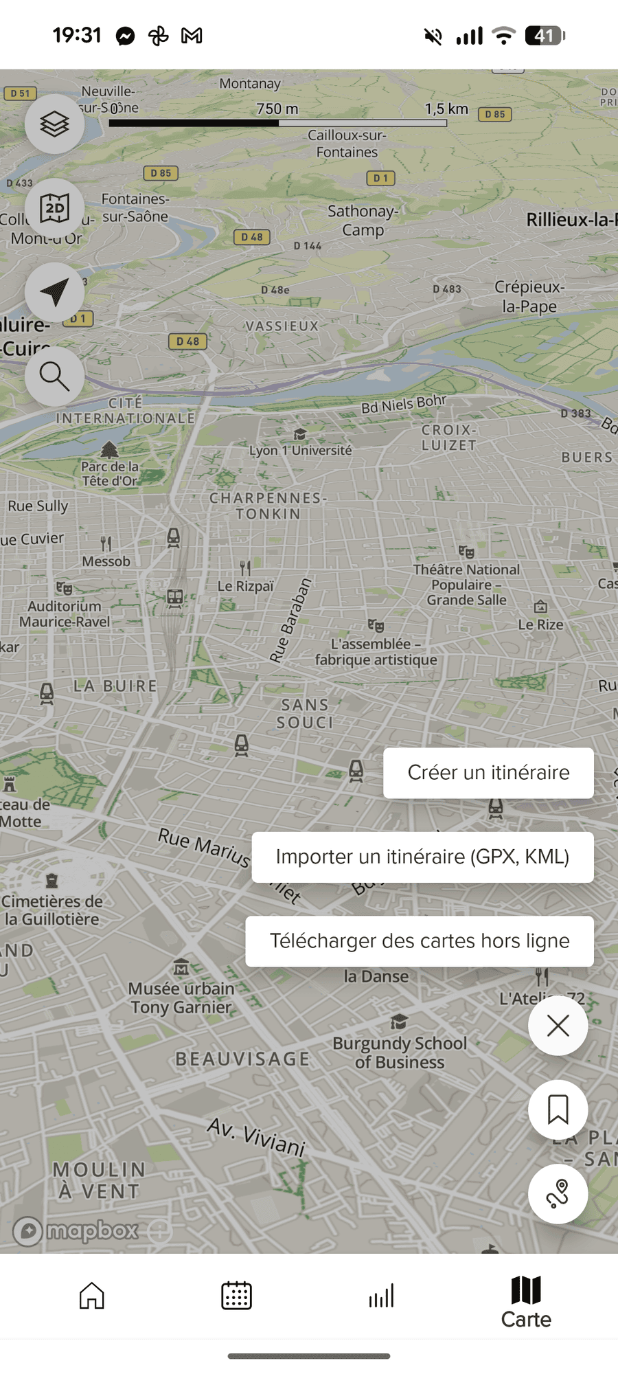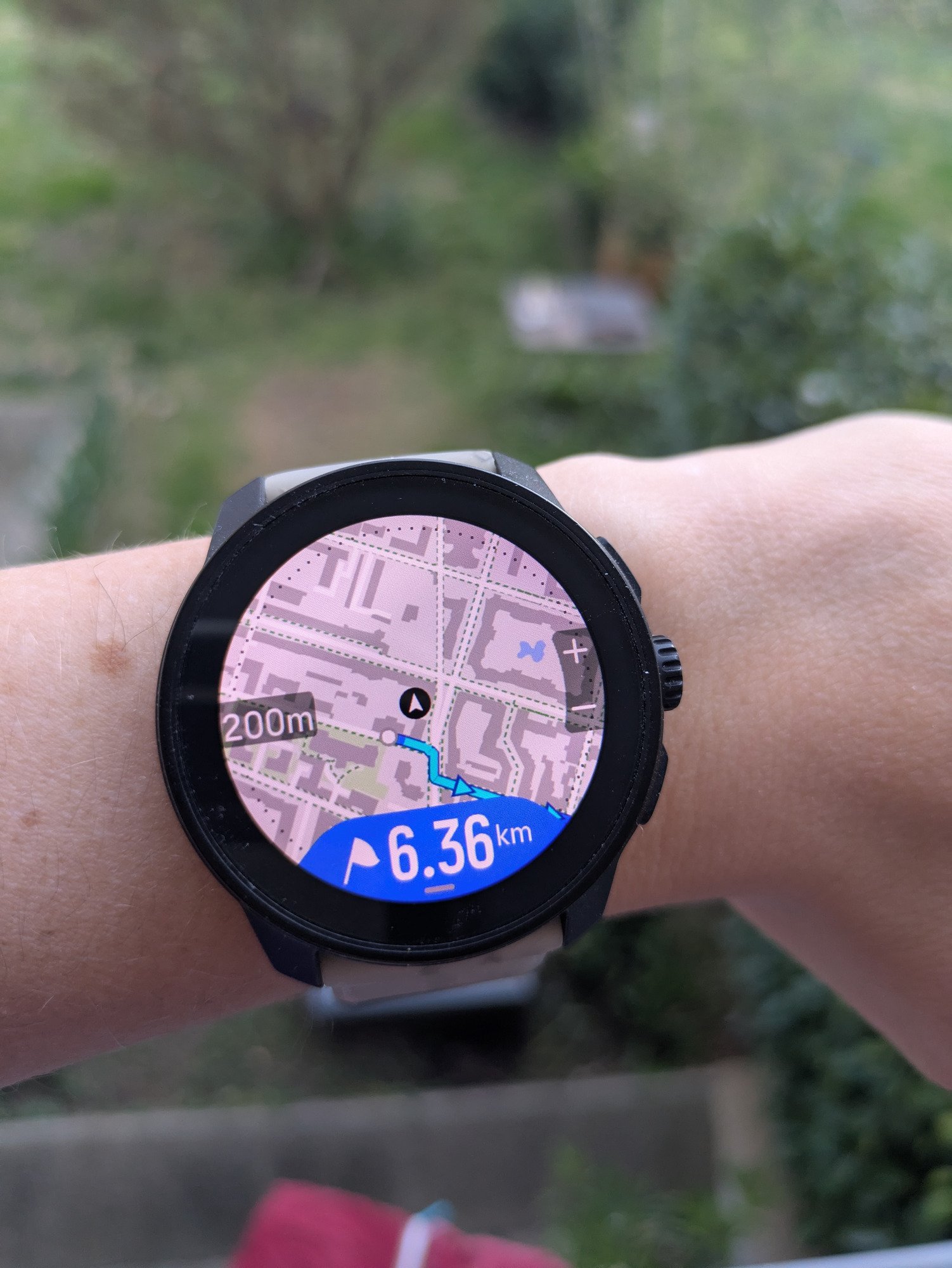 - cartographie hors ligne : c'est surtout pour ça que je l'ai acheté, plus besoin de sortir le téléphone à chaque intersection pour vérifier sa direction ! Elle est très efficace là dessus, le zoom se fait facilement avec la mollette, le fond de carte est très lisible, même en vélo avec la vitesse ça reste bien positionné. On peut créer des itinéraires directement sur l'application de Suunto puis les télécharger en hors ligne.