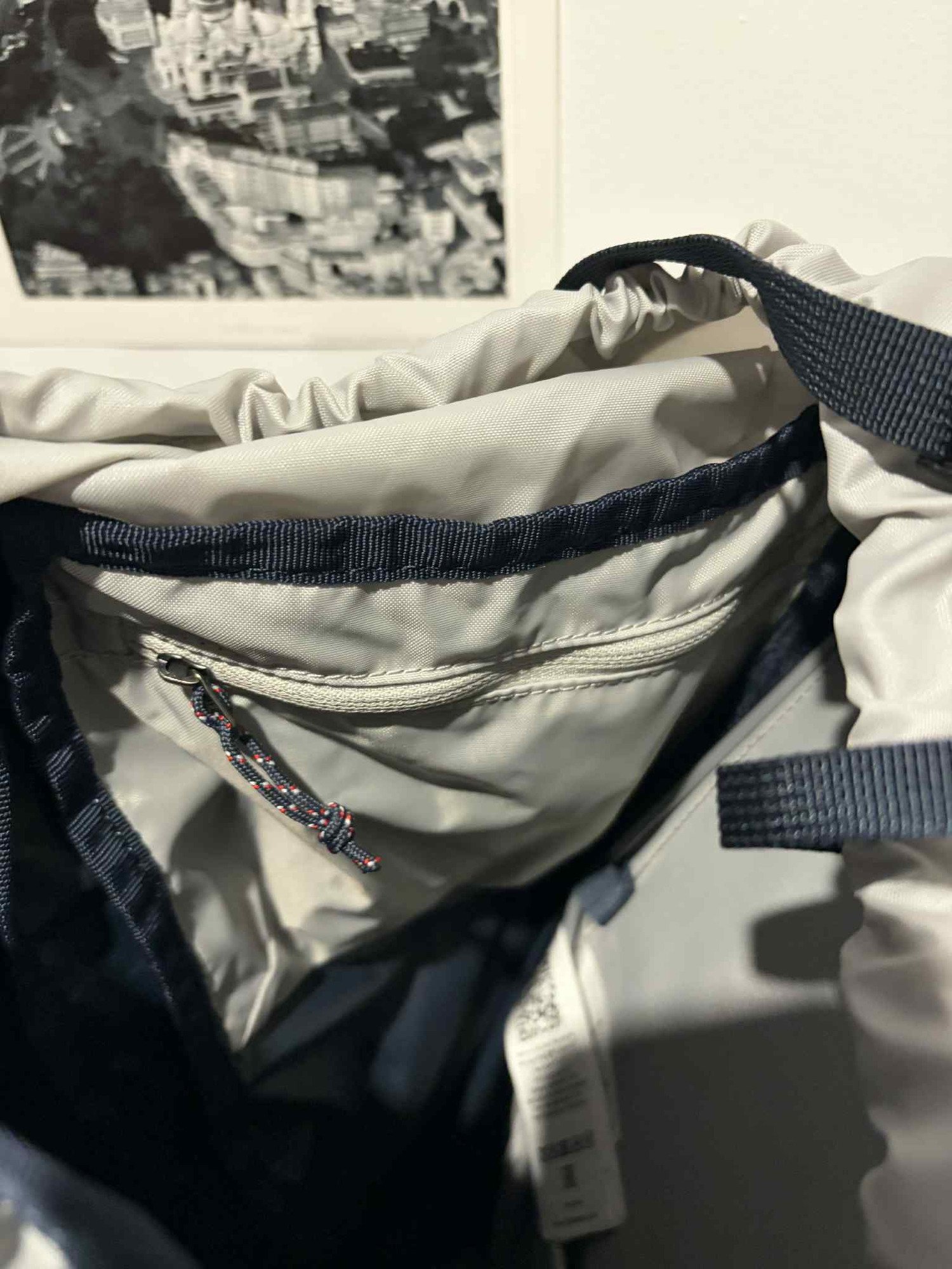 Le rabat supérieur possède 2 compartiments zippés dont 1 avec la housse de pluie. Un cordon élastique est présent en haut du sac pour y accrocher une veste ou autre.