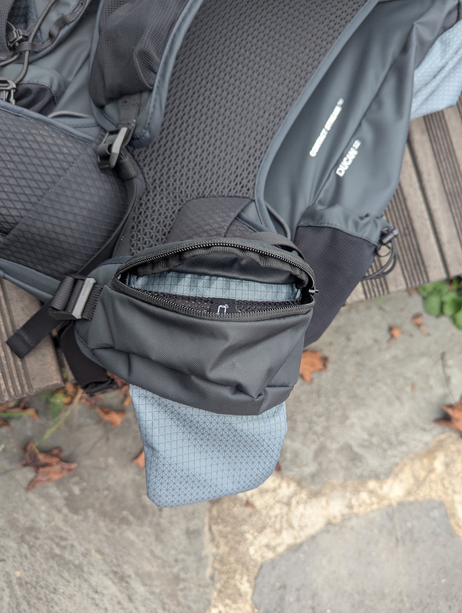 - 1 poche filet et 1 poche zippée sur la ceinture abdominale avec emplacement spécifique pour le téléphone.