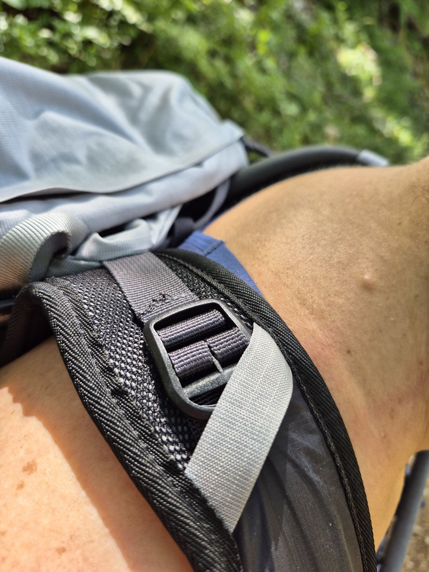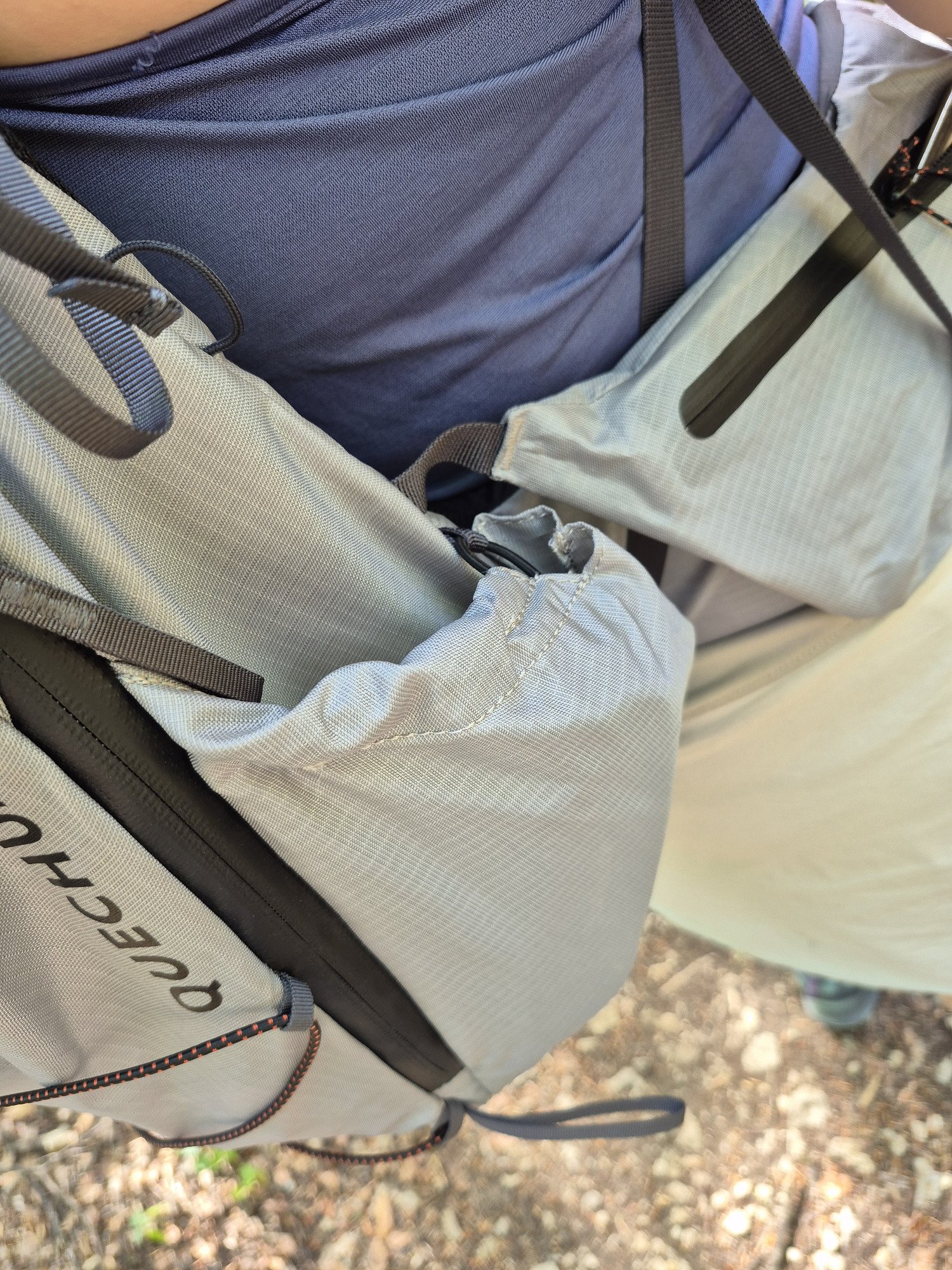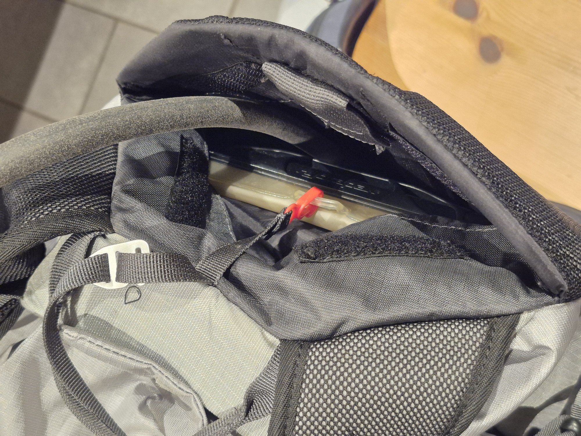 La poche principale est assez vaste et est accessible par le haut ou par un zip latéral ce qui est bien pratique même si l'ouverture zippée pourrait être un peu plus grande. La poche secondaire n'est pas énorme et est accessible via un zip latéral opposé à celui de la poche principal. Le compartiment pour la poche à eau est extérieur à la poche principale, ce que je trouve plus pratique, elle est donc juste derrière le dos et facilement accessible si on doit recharger en eau en cours de randonnée. Deux scratchs sont là pour fermer ce compartiment mais ils sont totalement inefficaces, ce qui n'est pas un gros problème en soit car ils ne sont pas très utiles, la poche à eau n'ayant pas tendance à sortir si on se penche.