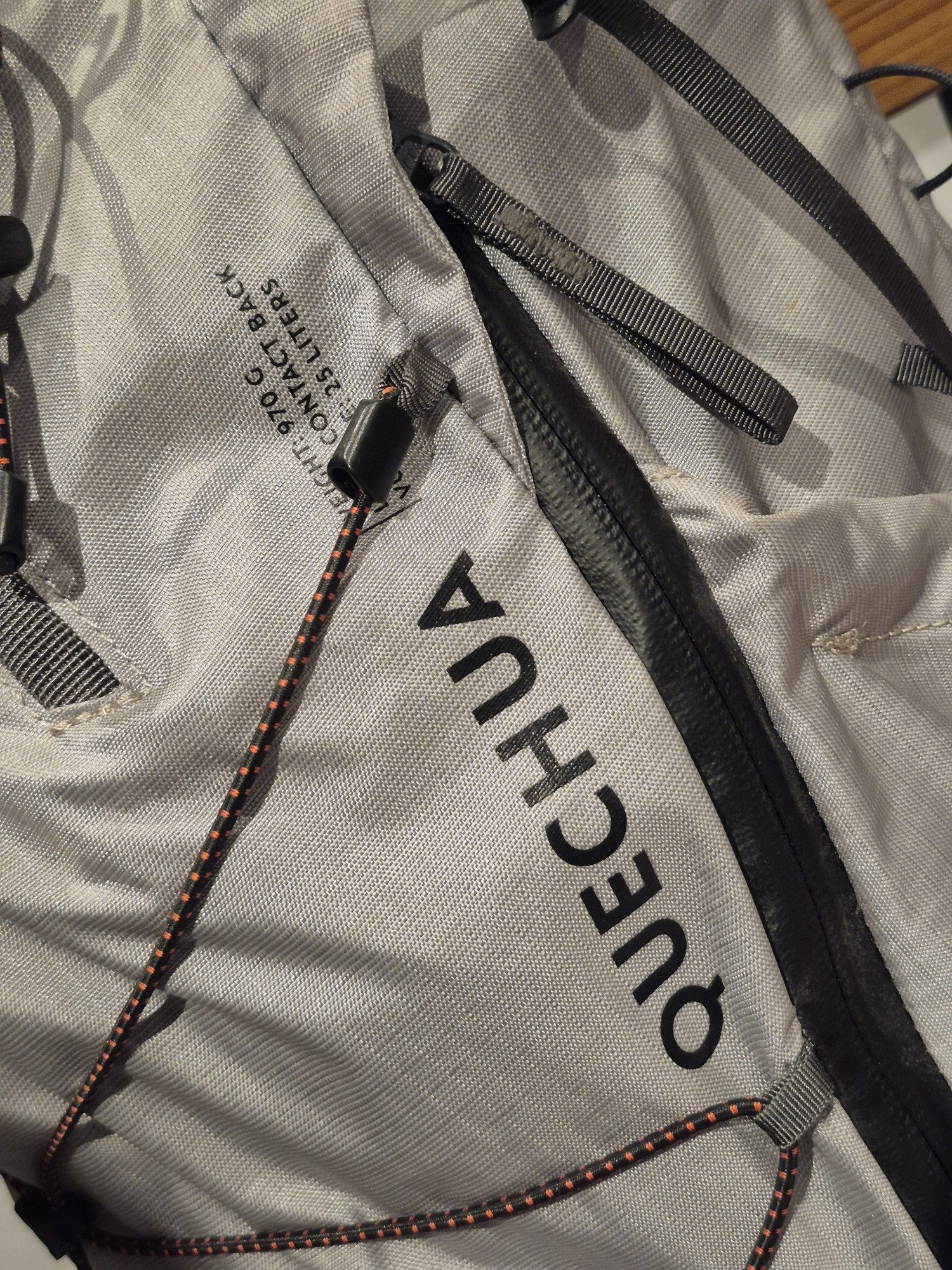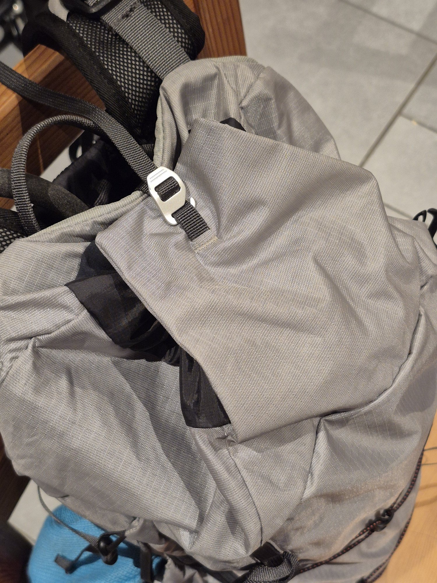 La deuxième chose, je voulais gagner un peu en poids. Pour ce point, c'est moins impressionnant, on est juste sous le kilo, ce qui n'est pas super léger pour un sac de 25L mais je gagne quand même 250g. Vu l'accessoirisation, on va dire que le poids est correct (mais on est encore loin des 470g du 20L RAB de mon mari). On peut retirer le "chapeau" pour gagner un peu de poids en ne perdant que 2L. A noter que le sac ferme bien sans le chapeau avec un petit rabat et qu'il y a une toute fine bandoulière (non réglable) pour emporter le chapeau comme petit sac "à main".