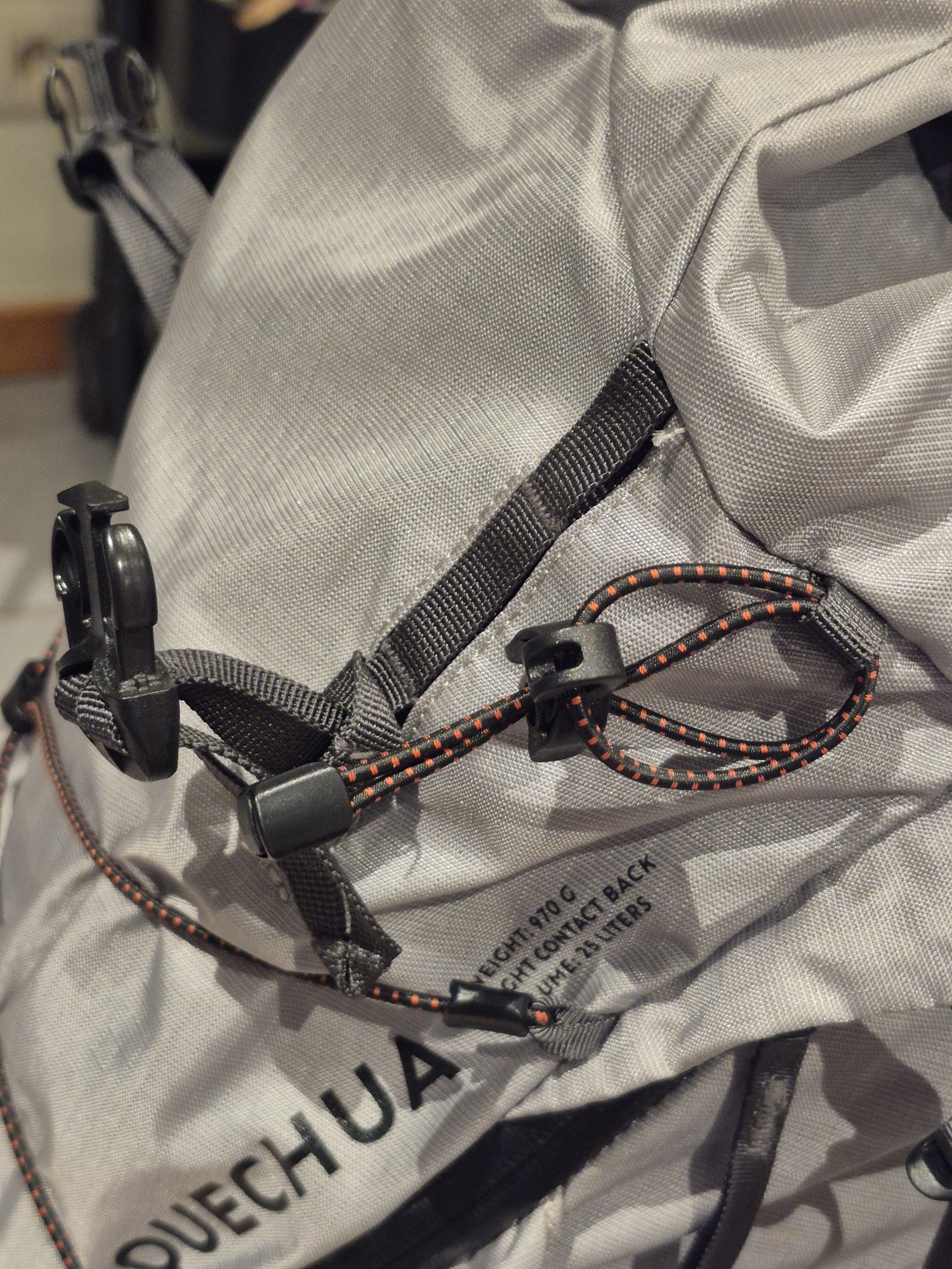 Un élastique frontal permet une certaine compression du sac ou de mettre une petite veste qui doit rester facilement accessible. Par contre pour tendre cet élastique, il faut accéder à la poche secondaire par le zip ce qui n'est pas du tout pratique, surtout si le sac est assez rempli.