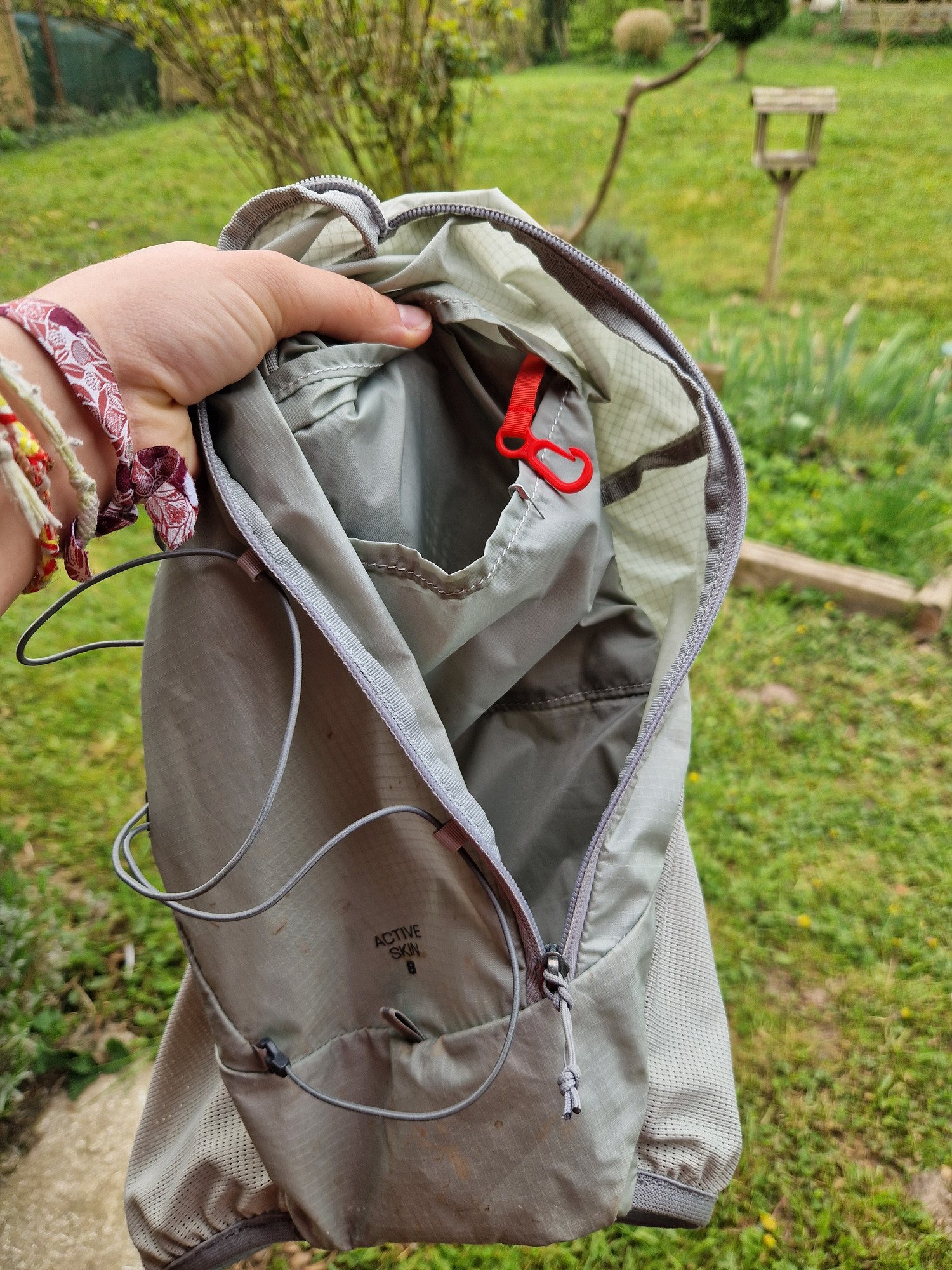 Il dispose, à l’avant, de 2 poches à flasques de 500ml (maintenues pas un élastique au niveau du bouchon), 2 grandes poches pour mettre téléphone, compotes, barres, saucisson? , pâtes de fruits... ; 1 poche à zip pour sécuriser le clés par exemple et à l'arrière, d’une grande poche à zip (des vestes de pluies y rentrent) avec un mousqueton ainsi qu'une plus petite poche sur le haut. Il dispose également d’un compartiment pour mettre la poche à eau (jusqu'à 2L, je n’ai pas testé plus) et d’un cordon réglable aussi pour mettre des vestes s’il ne pleut pas (cf images)