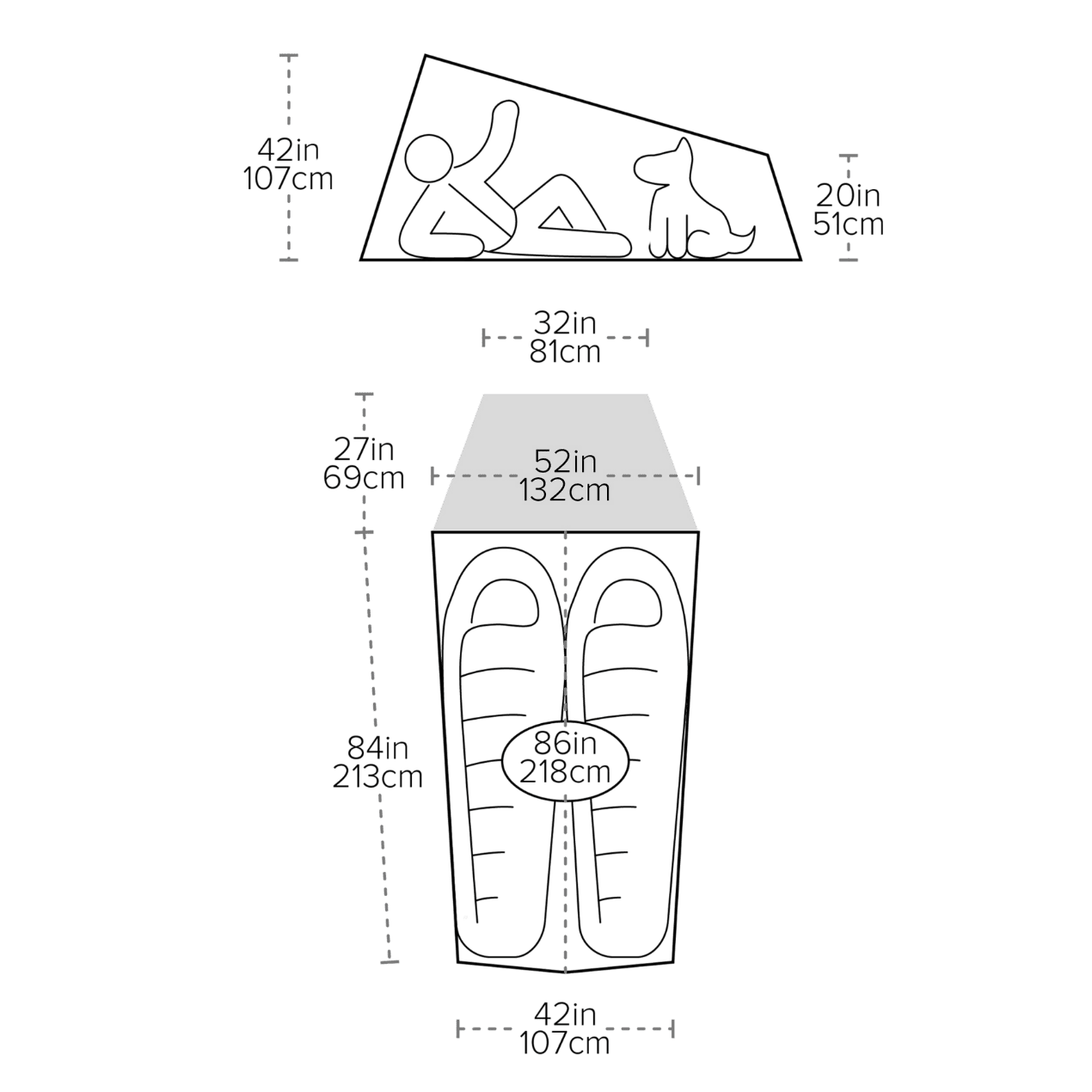 Elle se présente avec un arceau semi-autoportant en Y, avec une seule entrée. Du fait du Y, l'espace est élargi à l'entrée pour s'affiner vers les pieds. Les dimensions sont similaires à celles annoncées par Big Agnes (voir les photos).