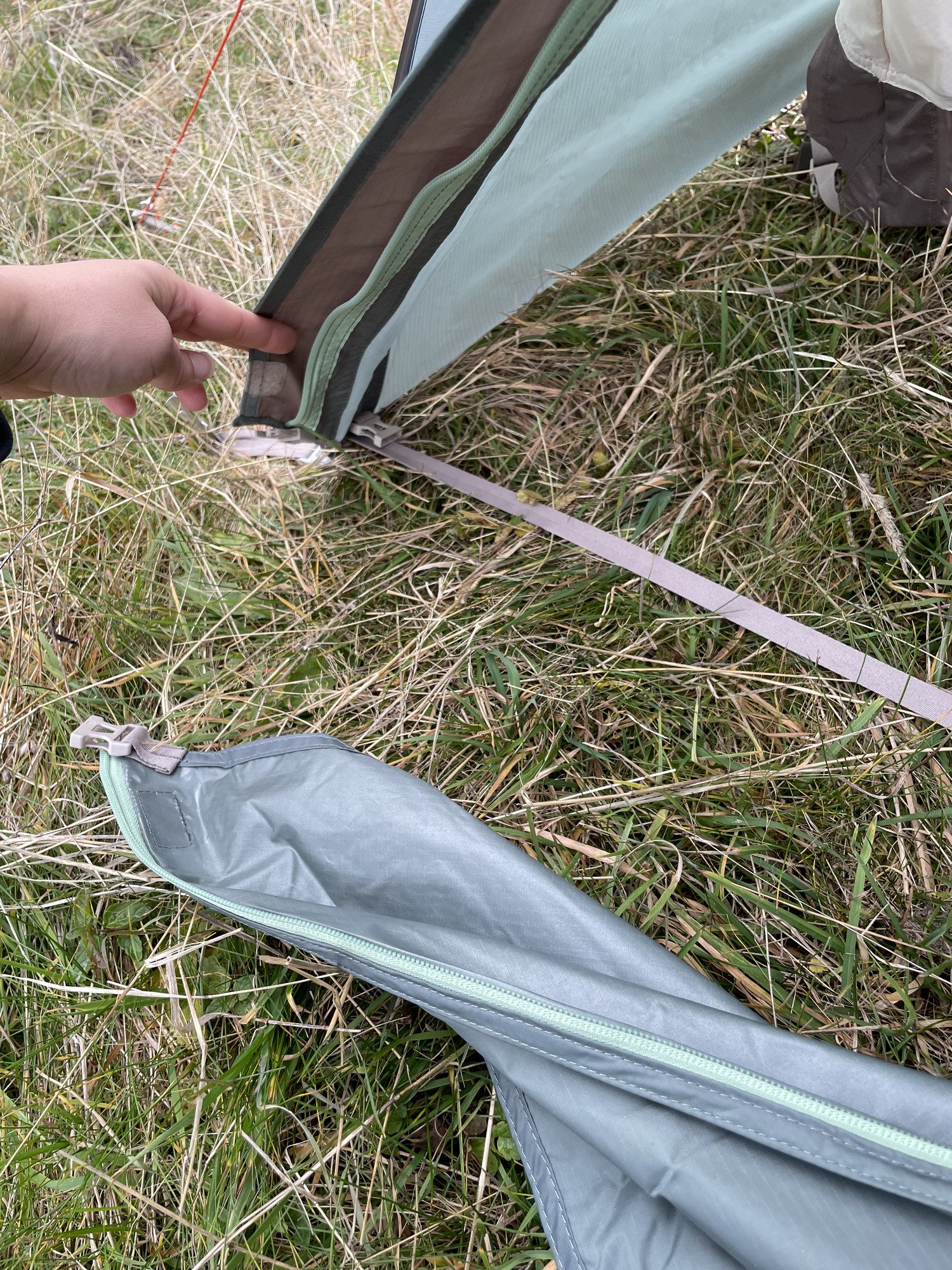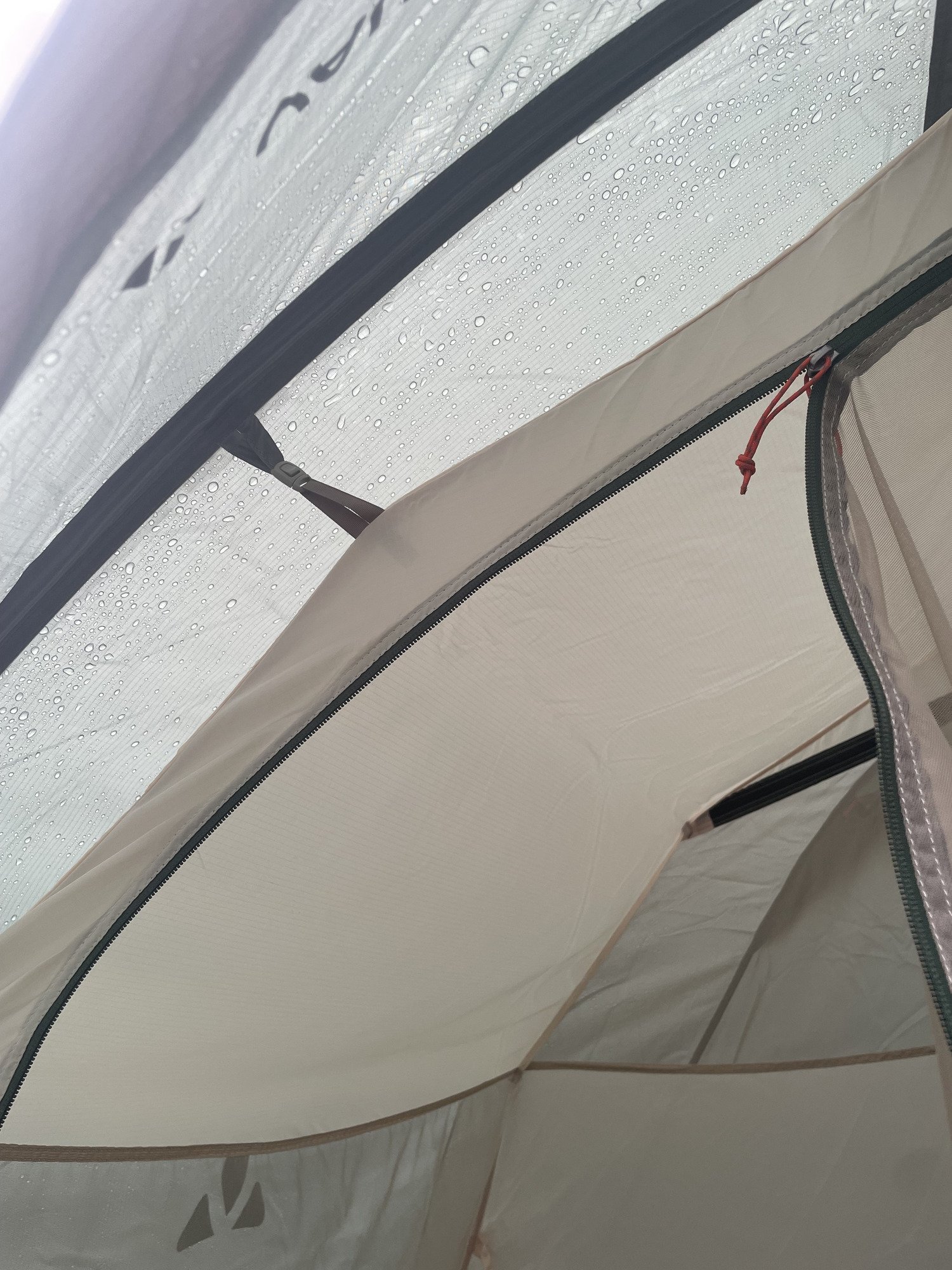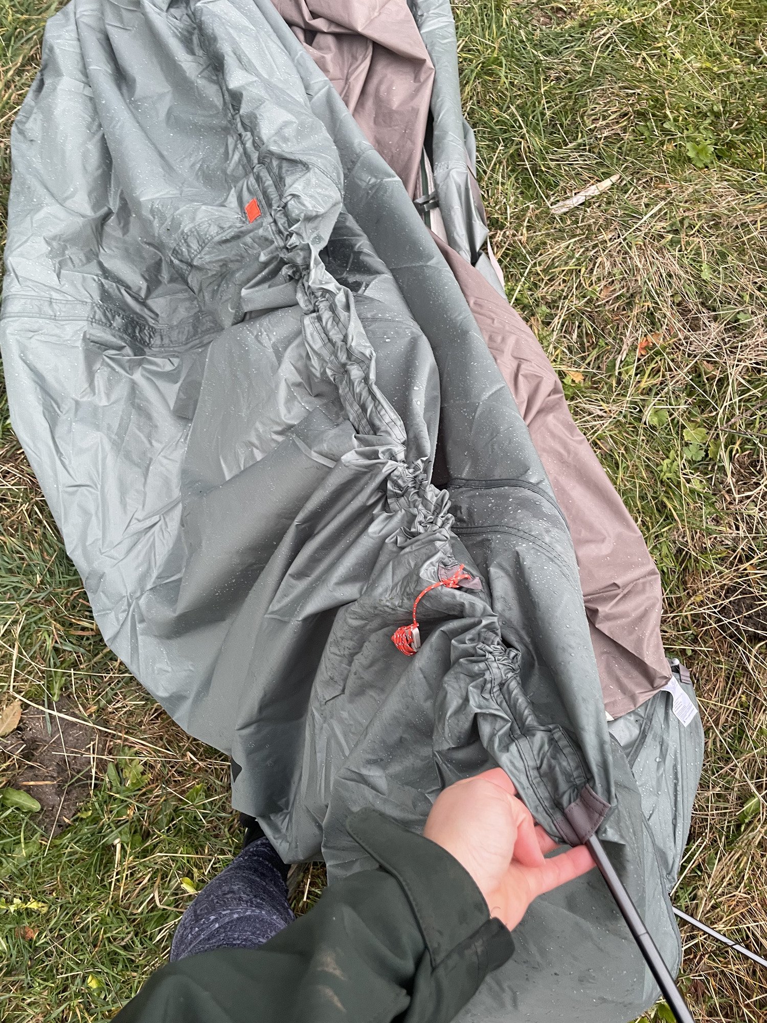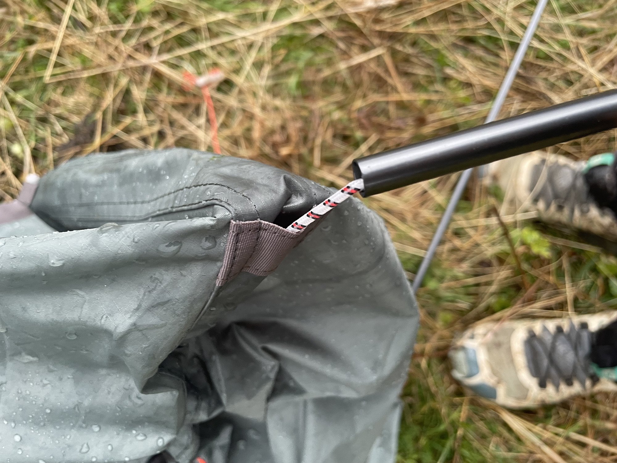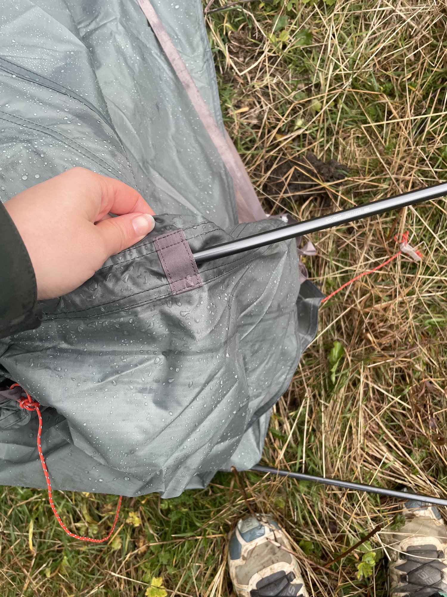 Soyons honnête, je ne suis pas la plus grande spécialiste du montage de tente ne faisant qu'occasionnellement du camping mais je cherchais un "cocon" pour mes bivouacs... alors l'occasion de tester cette tente s'est présentée et je l'ai saisi ! Résultat, je suis très perplexe... la tente est difficile à monter seul, vraiment difficile... pourquoi ? Vaude a cherché à diminuer le poids de cet équipement en ne mettant que deux tiges en aluminium sous forme de brins qui s'emboîtent les uns dans les autres pour la tenir. Ces tiges doivent être glissées chacune dans un passant dont le bout et fermé et l'extrémité restante doit être coincée dans un emplacement (il faut mettre de la force pour tordre et donner forme à la structure). Le fait est qu'il n'est pas aisé de glisser les tiges dans cet emplacement en question, la structure rigide de la toile et la faible résistance les tiges font que les brins se séparent et viennent se coincer dans la structure. C'est ce point qui est compliqué à gérer seul ! il faut avoir une deuxième personne avec soi qui ne s'occupe que de la tige pendant que l'autre se charge de tendre la toile pour fluidifier le passage. Il est absolument nécessaire d'être calme, patient et d'avoir du temps devant soi ... à deux reprises, la pluie venait et mettait mon self-control à rude épreuve.