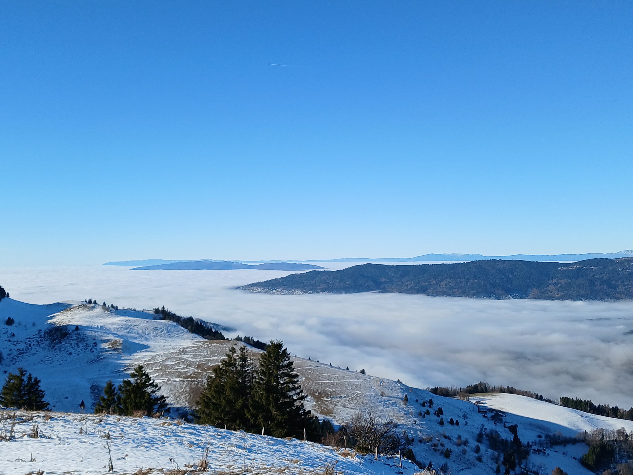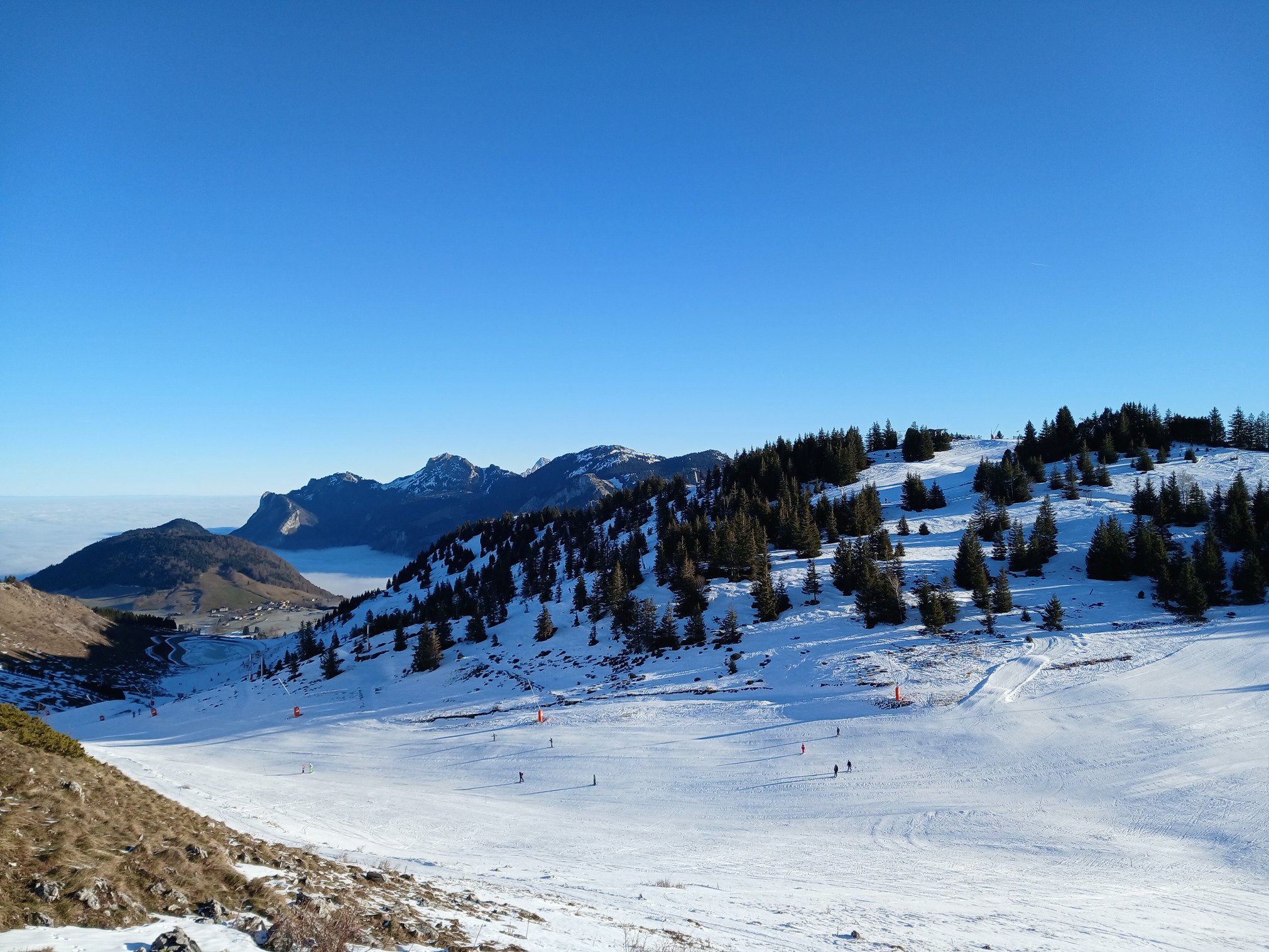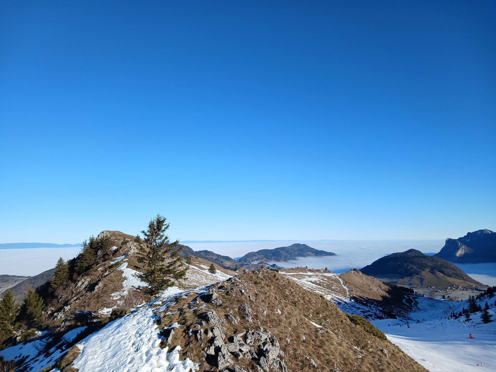 La neige y est toujours présente malgré le manque d’épaisseur évident vers 1’600m d’altitude. C’était d’ailleurs assez déroutant d’observer les pentes herbeuses légèrement blanchies par endroit sur les versants ouest, sud et est pour tomber nez à nez avec des skieurs alpins côté nord au passage du col du Haut Ferron. Merci aux canons à neige et à la réserve d’eau présents sur la station de Bellevaux 😉