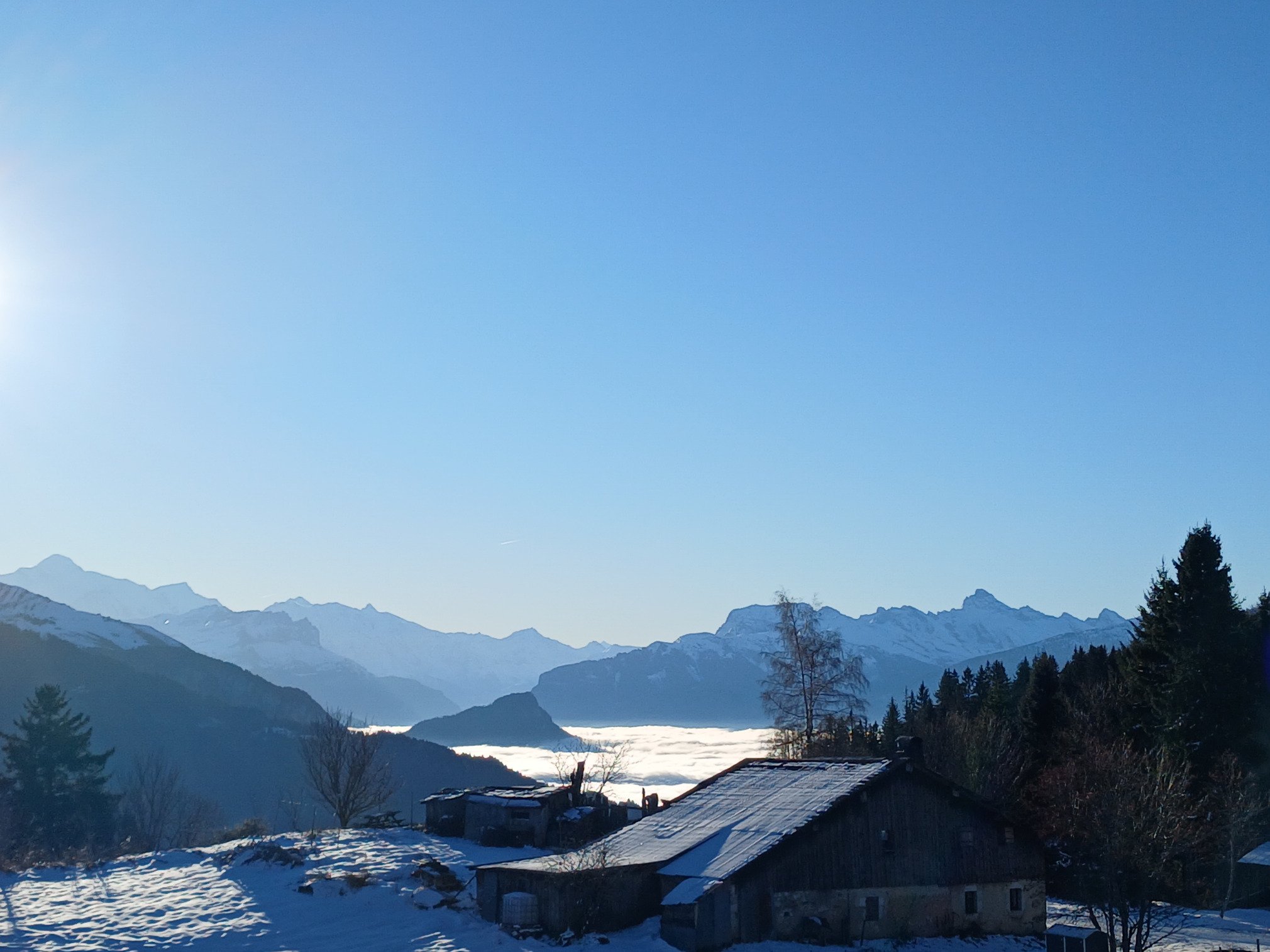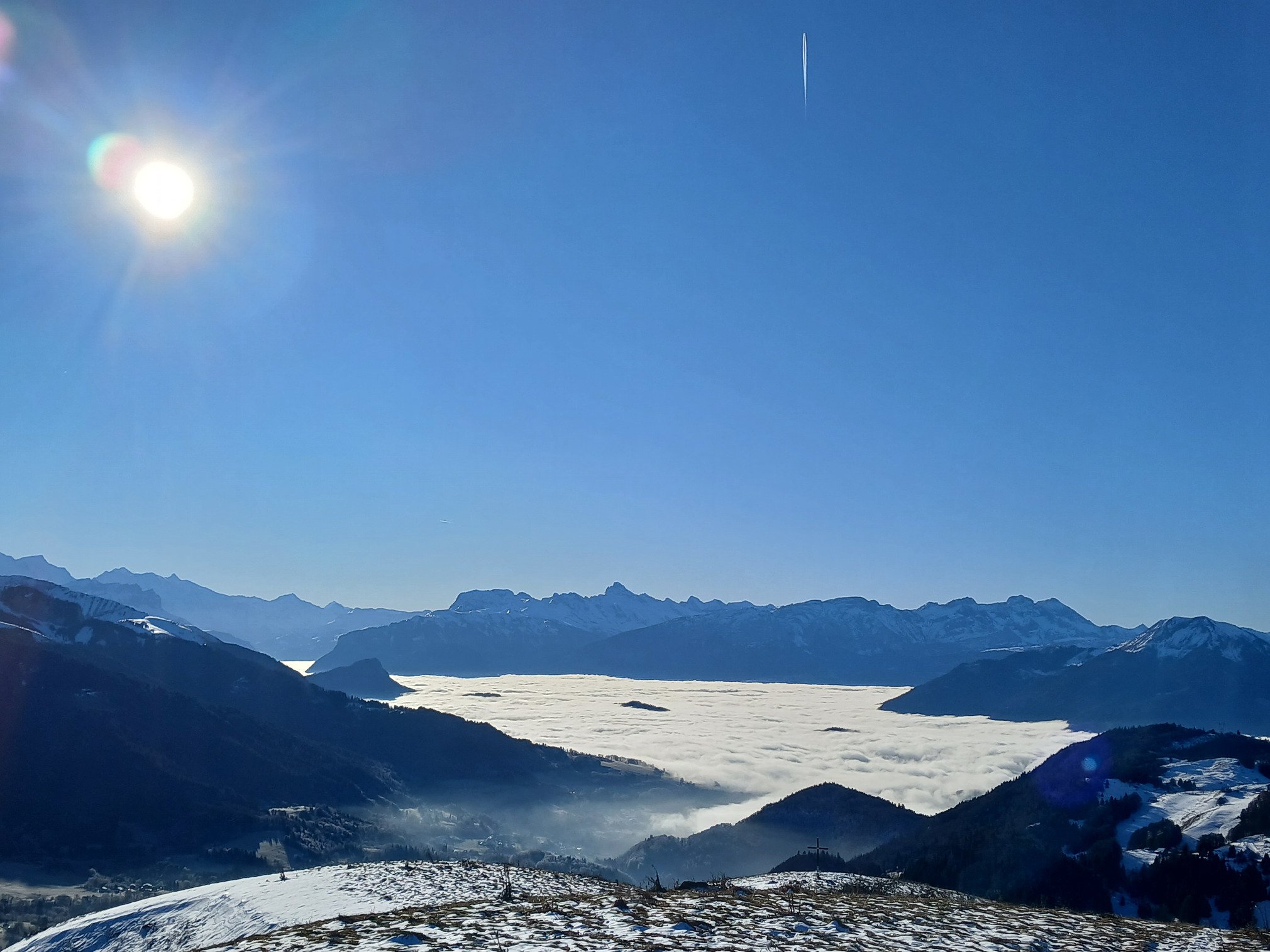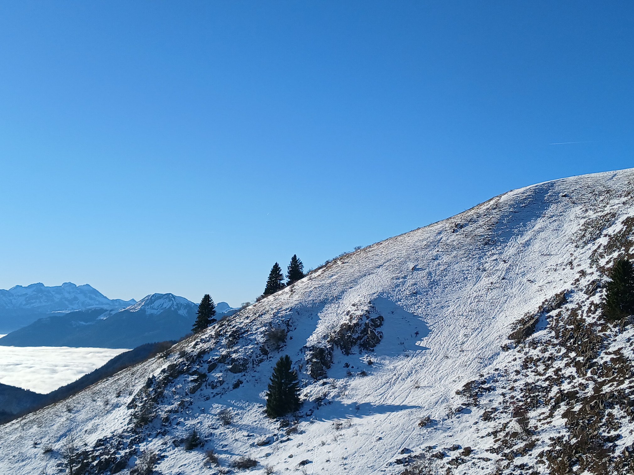 La neige y est toujours présente malgré le manque d’épaisseur évident vers 1’600m d’altitude. C’était d’ailleurs assez déroutant d’observer les pentes herbeuses légèrement blanchies par endroit sur les versants ouest, sud et est pour tomber nez à nez avec des skieurs alpins côté nord au passage du col du Haut Ferron. Merci aux canons à neige et à la réserve d’eau présents sur la station de Bellevaux 😉