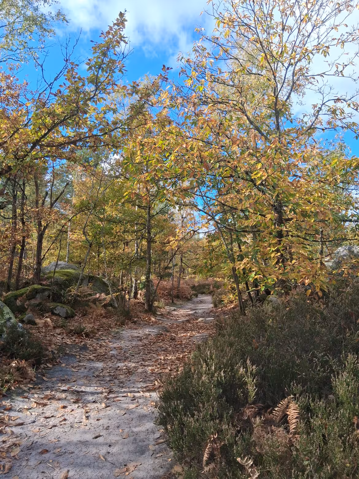 Les couleurs automnales sont magnifiques... D’abord la piste cyclable traverse les champs de betteraves sucrieres, céréales, longe l’auqeduc du Loing pour deboucher au Télégraphe.. Un joli massif forestier avec des rochers, chataigniers, chenes, bruyere... et 🍄.