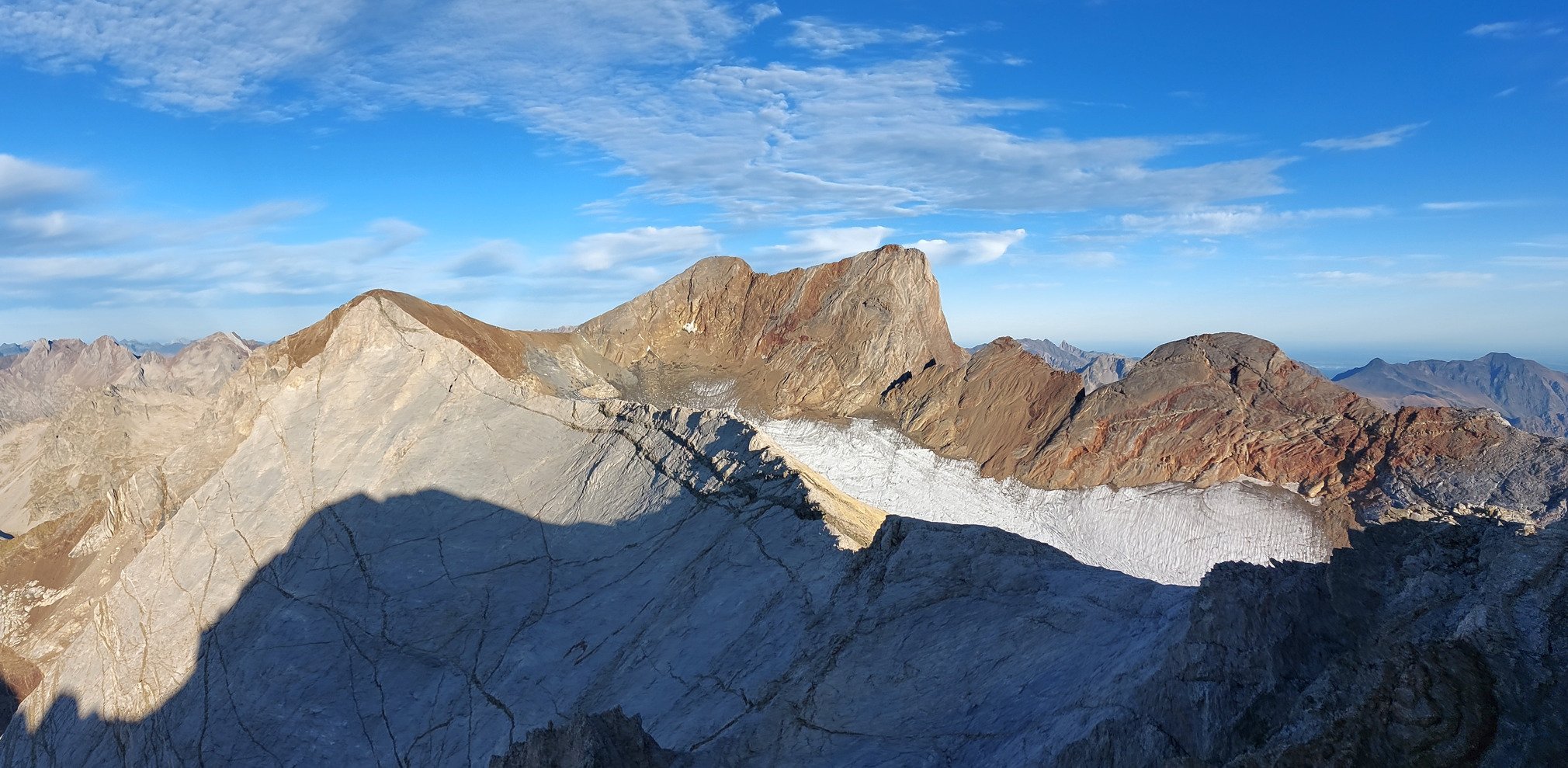 Dodo au barrage d’Ossoue puis départ à la frontale (même si la pleine lune éclairait déjà pas mal !) direction le Pic de Monferrat (3 219m). La vue sur les Neveros de Labaza, des énormes dalles de plus de 500m de haut, est géniale. Après, c’est à toute crête (bien gazeux, donc, mais jamais difficile) vers Pic Central (3 235m) puis Cerbillona (3 247m). On domine le glacier d’Ossoue qui résiste comme il peut (mais on est loin des images de Booz !!). Ensuite c’est A/R vers le Pic du Clos de la Hount (3 289m), on pose un peu les mains, mais rien de méchant, puis faut mettre les crampons pour traverser tout le glacier puis remonter jusqu’au refuge de Baysselance, où le bol de café m’a fait le plus grand bien. Requinqué, et sans sac à dos, laissé au refuge, l’A/R au petit Vignemale est fait en mode énervé !! Et quel bonheur de finir ainsi. Il me manquait 4 sommets pour compléter ce projet de faire tous les 3000s des Pyrénées françaises, j’ai rajouté le Cerbillona parce que c’était sur la route (mais je l’avais déjà fait en ski de rando avec l’ami Yrlab).