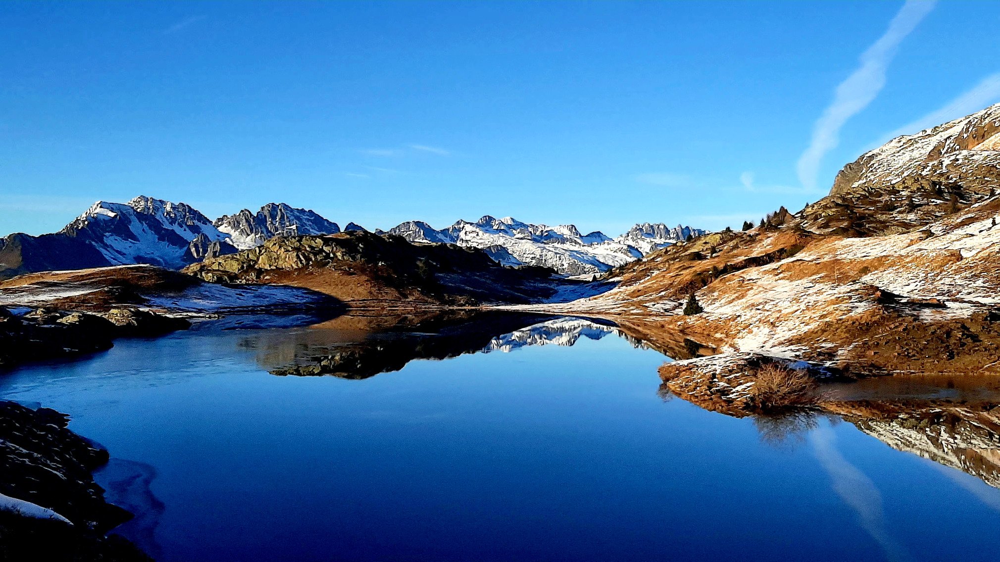 Sur le chemin, les petites étendues d'eau révèlent le grandiose Pic Blanc.