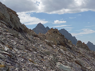 Le descente se fait sur le col de traverse. Pas de sentier mais pas de piège pour cette descente dans une pente de pierres.