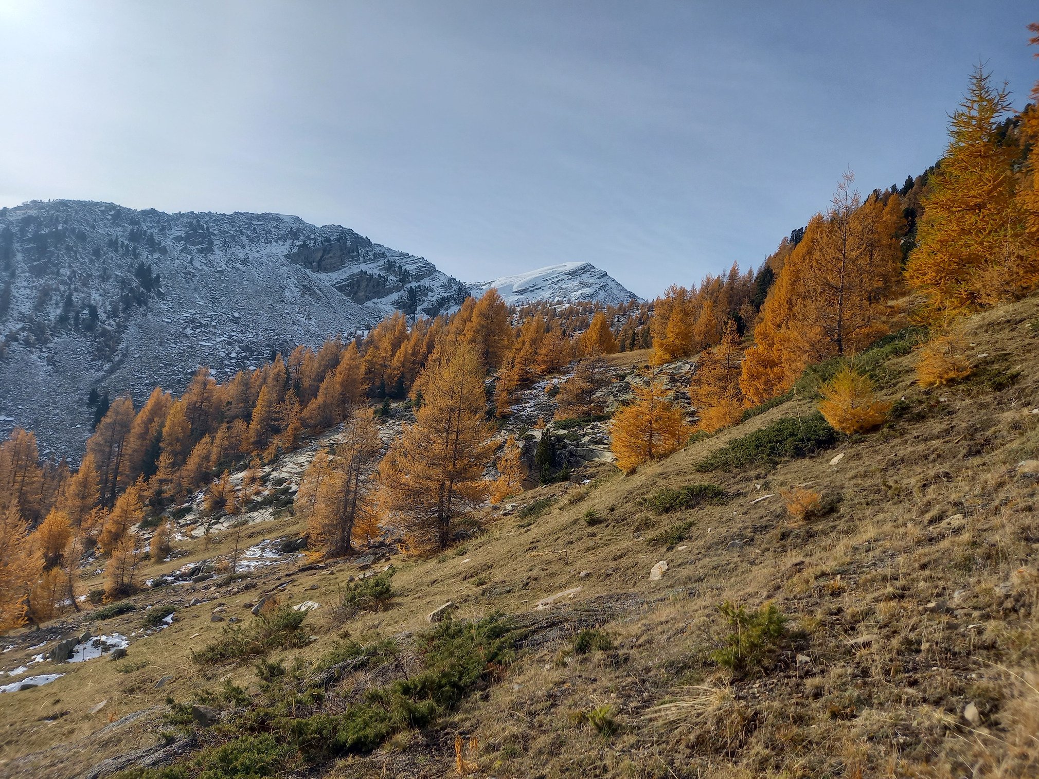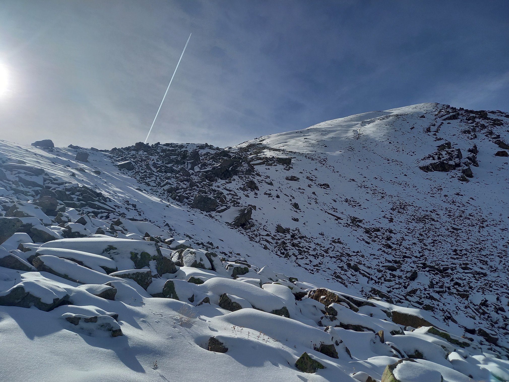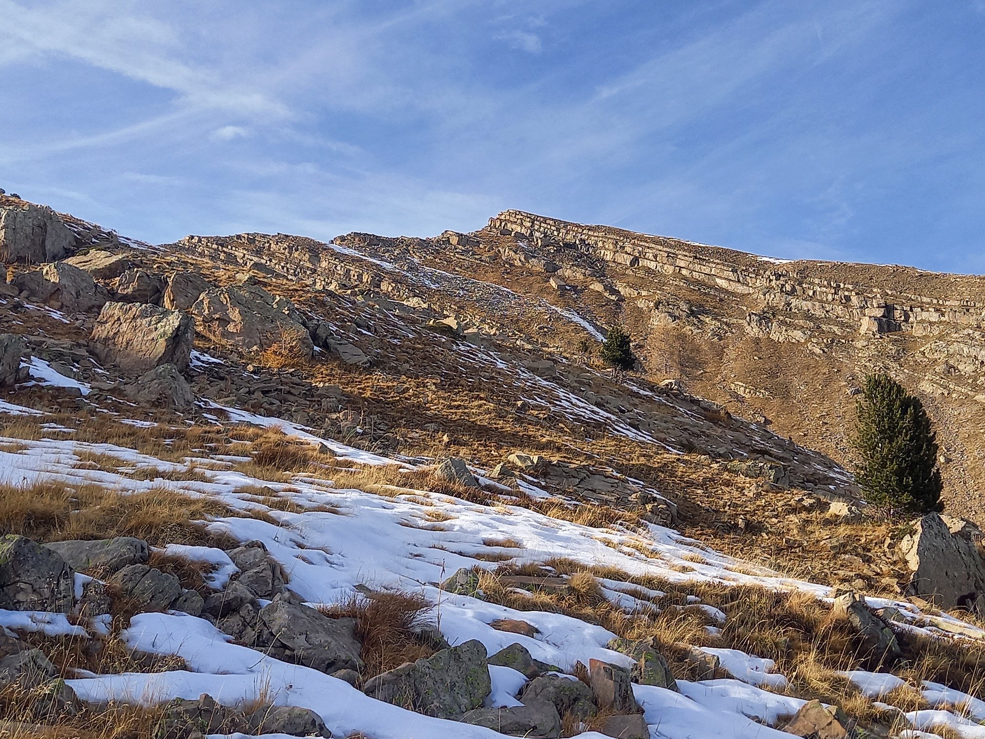 Descendue par larete nord sans neige, puis dans le vallon pour rejoindre le cabane et le chemin.