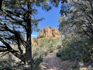Au départ du Col de Belle Barbe, le sentier nous fait évoluer au milieu de ces blocs de roche rouge typiques de l’Esterel. Passage par la dent de l’ours puis le pic de l’Ours quelques mètres plus haut (Alt 488m). Le point de vue sur la Méditerranée, Cannes et le reste du massif est alors grandiose.